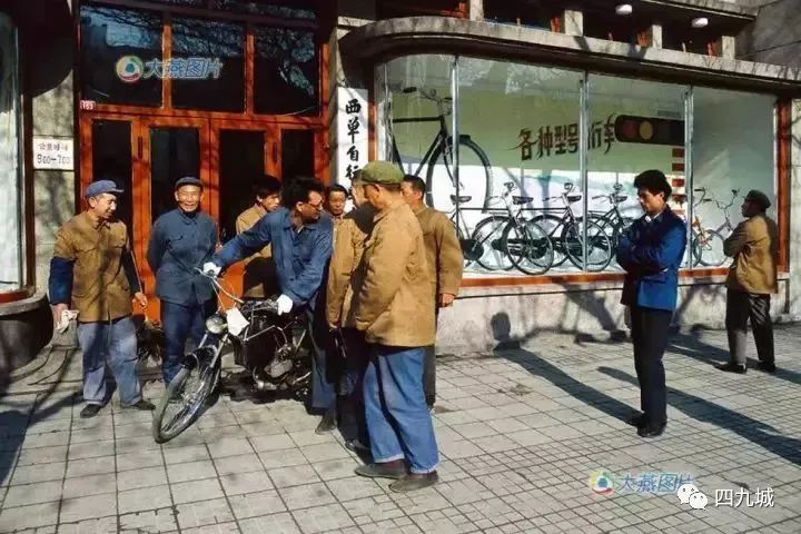 1979年,西单一家国营自行车商店门口。自行车商店门口站着许多人,在围观一辆半新的摩托车,有顾客也有营业员。商店的橱窗很大,空旷,但没有任何装饰,只摆放几辆上海产的新品牌自行车。商店门脸没有任何商业广告,店前的大街上也没有任何政治标语。