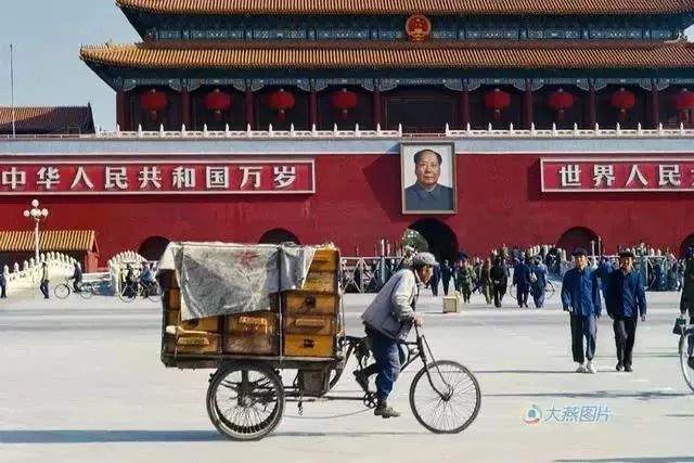 1977年5月1日。每天穿越天安门的车辆主要是自行车、手推车,不多的公共汽车和很少见的小汽车。
