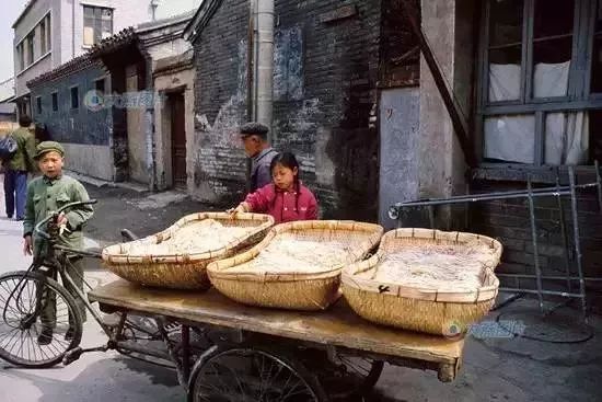 1979年5月。北京人爱吃面,车上的篮子里放着刚刚压出来的新鲜切面,旁边的孩子在帮大人看车,车上的面条可能是附近一个餐馆预定的。