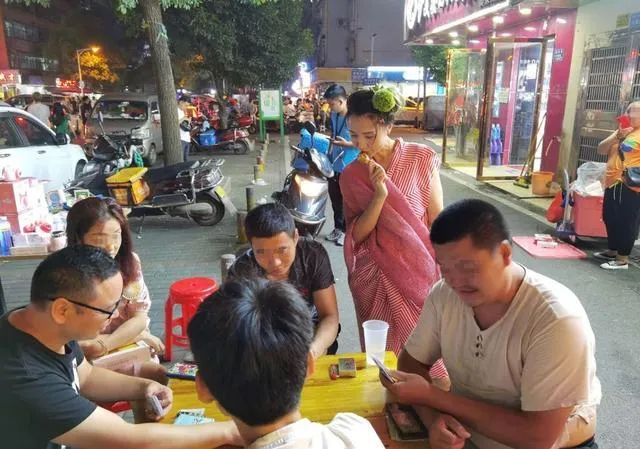 在街头啃着鸡腿,围观大爷打牌。