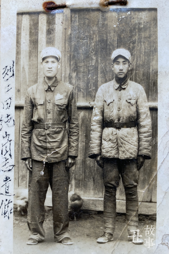照片上有两个男人,二三十岁,身着军装,并排站在一间木板房前。左边男人的军装单薄一些,脚边还有一只模糊的小鸡。右边男人穿着军装棉服。