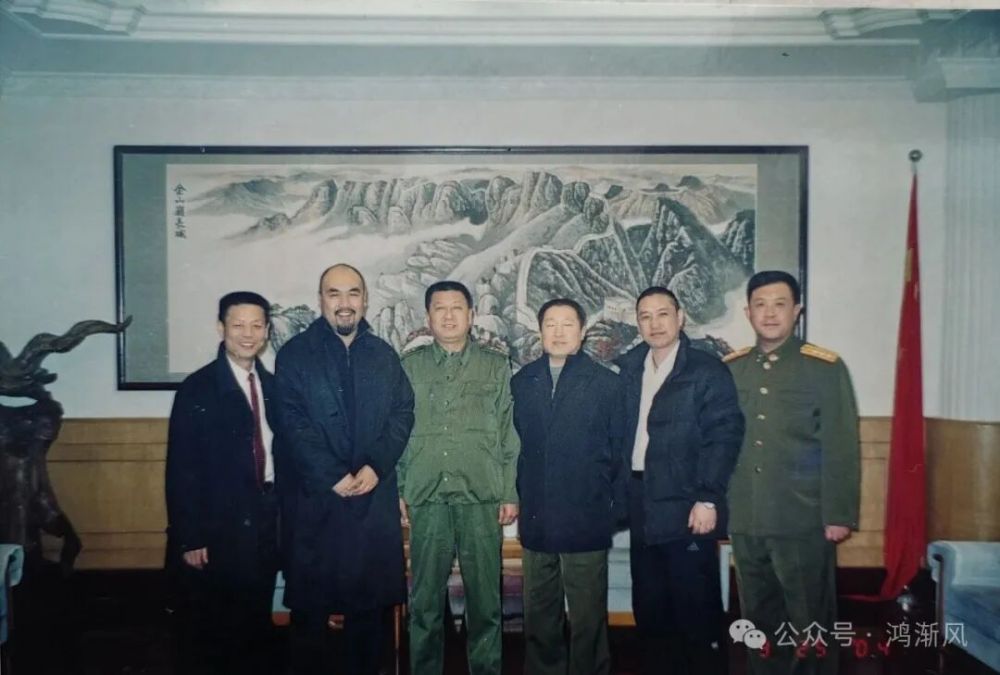 2004年,作者(右二)与同在一个部队当过兵的武汉籍战友肖新富(左一)、战友臧金生(左二《电视剧<水浒>中鲁智深扮演者》)重访原部队,与时任196旅旅长、政委,及总参邱大校合影