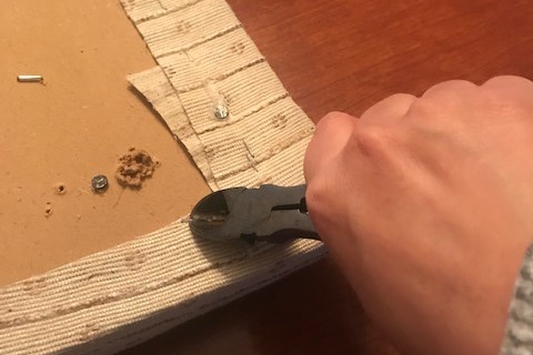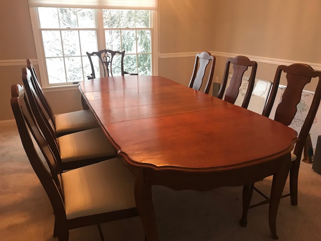 自从给朋友女儿翻新了扶手椅后,手又痒了。想想家里餐厅旧家具,只把餐桌重新油漆,打磨过,椅子面还没有翻新,正好可以做。趁着新鲜劲,周日到皮料店,淘了一张非常柔软的牛皮,趁着今天下雪,下午陪着儿子,把7个凳子面全部翻新改造了。结果我相当满意,干净,大气。对了,还要重点表扬一下儿子,妈妈的好帮手,做的像模像样的,帮忙起了很多staples,好孩子!