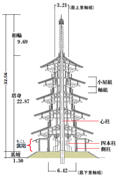 联系上篇对“遣隋使”的考证,更多的迹象在暗示我,曾经的中国匠人可能参与了法隆寺的营造,然而近在咫尺的法隆寺五重塔的“心柱”,成了我绕不过的坎,将我的身子紧紧“栓”在原地,而这个坎在数月后,我阅读了古书后不经意地消失了,消失得使人豁然开朗和无比喜悦。关于五重塔中间一根靠基线以下近两米的石台作基石支撑,而直撑塔顶的木心柱,在中国古建筑教材被叙述为日本特有的“建塔方式”,它有别于中国古塔每层塔楼可以登楼远眺,日本古塔除了底层外就没法进入这一定论。我在梁思成先生所著的《中国建筑史》中注意到了先生提及的一本古书,北魏末年杨衒之所著的《洛阳伽蓝记》。书名“伽蓝”是印度语音译,指寺庙建筑和其庭院。今天重新阅读时留意了此书记述的北魏永宁寺塔的建造情况,这座早于法隆寺五重塔一百年前的“土木结合”佛塔,除去夯土地基高度,净高136米,而法隆寺加上塔顶相轮总高是33米。在当时已经是如此高超的建造技术下,永宁寺塔内部应用的也是“心柱”方式来固定塔身,只不过它用的不是木料而是夯土,也就是中国古塔自古不是都能登楼远眺的,直到1056年建成著名的应县木塔,被梁先生视为中国古建筑史上撑起木构建筑最大极限的现存国宝后,我们可以认为塔也可以似楼阁般登高远眺。那么法隆寺五重塔以心柱方式建成也没有脱离中国古建筑理念,说它是日本匠人创造显然站不住脚。今天能亲临千年古刹,推翻了很多我以前的固有观念,缺乏史料记载或没有考证的部分,也许在实体上明白地“篆刻”着。