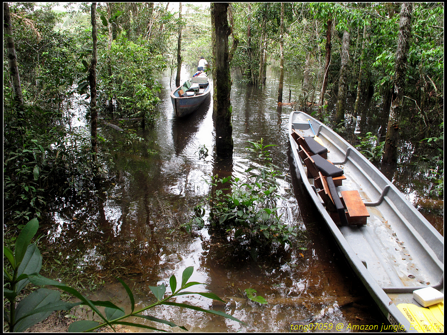 我去的时候是雨季,这又是个让人难以取舍的问题,到底是雨季好还是旱季好。我最终很喜欢雨季,雨季唯一的缺点是在雨里活动时人不大舒服,除此以外全是优点。雨季时河水涨得高,很多大树就浸泡到了水里,只剩下树冠露出水面,一丛丛的树冠蓝天白云里倒映水中,快艇穿梭其间时冲出的波澜往两侧荡开,人坐船里迎着船头风,竟不得不眯缝起眼睛。