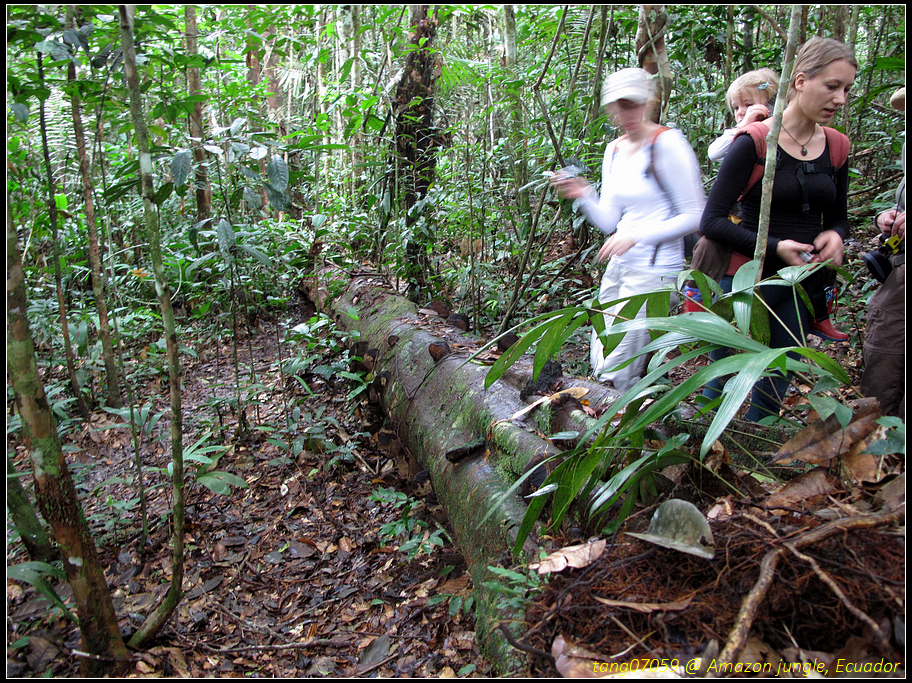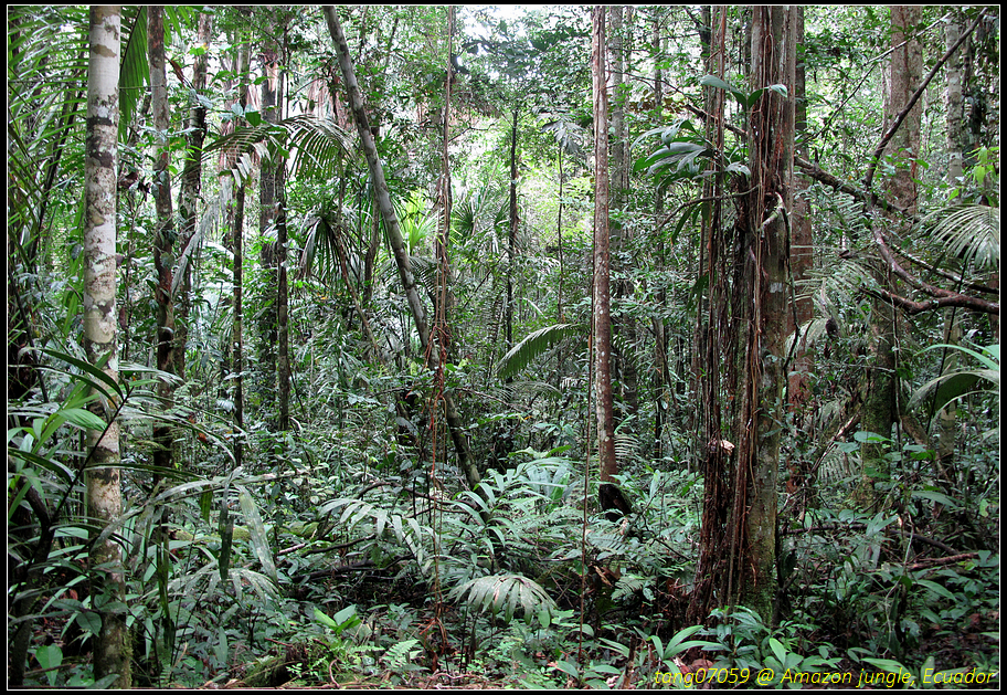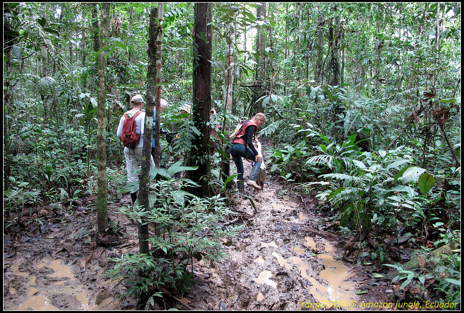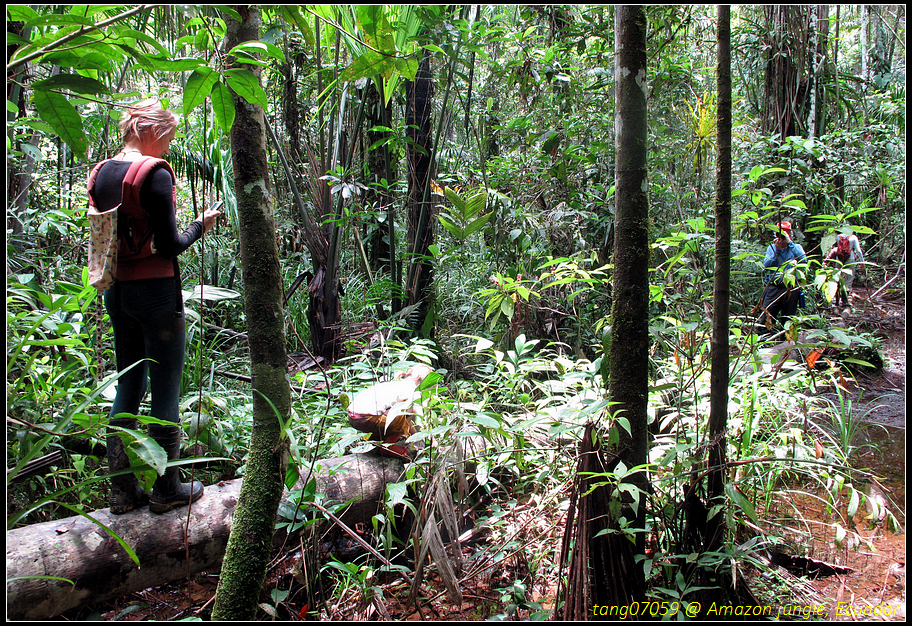 丛林里的活动大同小异。在河道宽阔的地方游泳、每天游;看粉色海豚(其实是淡水鱼类,所以也叫粉色河豚,但叫河豚会让我联想起日本人喜欢吃的河豚鱼,所以叫海豚至少形状上非常接近);钓食人鱼;丛林行走寻找动植物、昆虫;夜间丛林行走继续寻找动植物、昆虫;划独木舟;访问土人村落。动物包括各种猴子、树獭、鳄鱼、大蟒蛇、粉红色的海豚。亚马逊丛林动物处于最顶级的是美洲狮与美洲豹(Puma and Jaguar),不过这两种动物一般躲在丛林的深处,即便是资深导游,也只见过有数的几次,游客就不要心存幻想了。昆虫有各种蛙类(包括以前土人用来制造毒箭的毒蛙)、各种蚂蚁、各种蝴蝶。植物种类繁多,我几乎都记不住,我也只关心丛林里的巨树到底有多大。我进丛林的心态就是看热闹、看稀罕,而且心态很平和,对看多看少不计较,可能去过非洲的人有点曾经沧海。