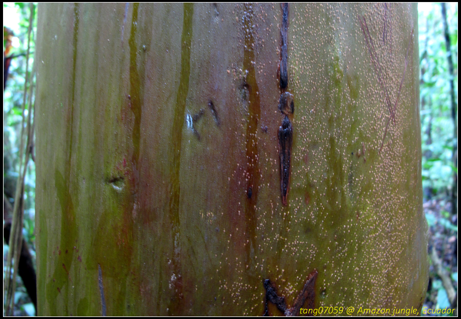 第二天上午丛林行走,大家都穿上度假村统一发放的高筒雨鞋。在这种雨林里,再高级的登山鞋、健步鞋都是没用的,只有这种像国内我们小时候穿过的高筒橡胶雨鞋才管用。导游带着走的小道有点泥泞,但跟着别乱走也不至于陷下去,在非常烂的沼泽处会有倒下的大树当便道,走那上面需要一定的平衡能力。导游走走停停给我们做介绍,这就苦了我了。美国来的这对是接近退休的年龄,女的能说些西班牙语,边听边给男的做翻译,问题在于她听懂的也有限,解释的时候我也不好意思凑到人家跟前去听。剩下的两个女孩,西班牙语是懂一点,但导游的一大段话她们能翻给我一句到两句就很好了,给我的感觉是她们也是有心无力。所以整个丛林游我有点猪八戒吃人参果,基本没嚼出滋味来。