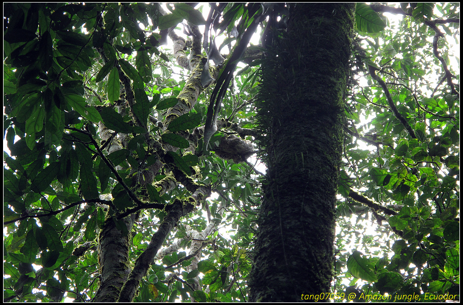 后来好不容易发现了一个树獭,盘在很高的树杈上,导游指给大家看,最差劲的几分钟后也看到了。大家拼命帮我,指来指去、换角度、用望远镜,我还是没看到。导游大概觉得我一路啥也没听懂,有内疚感,怎么也要让我看到。我理解她的好意,但把我弄得不胜其烦,我已经告诉她看不到也没关系,她依然不屈不饶,我头这么一直仰着,颈部奇酸不算,头晕眩得想吐。最后还是我想出个办法,把她指点的大致方位拍下来,然后把照片放大了找,等到她在照片上找到了树獭模糊的身影,我再对应回去,看是看到了,怎么看也像是树的一部分。