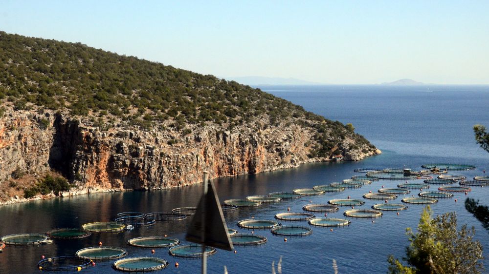 离科林斯运河不远的爱琴海峡湾里的海水养殖场