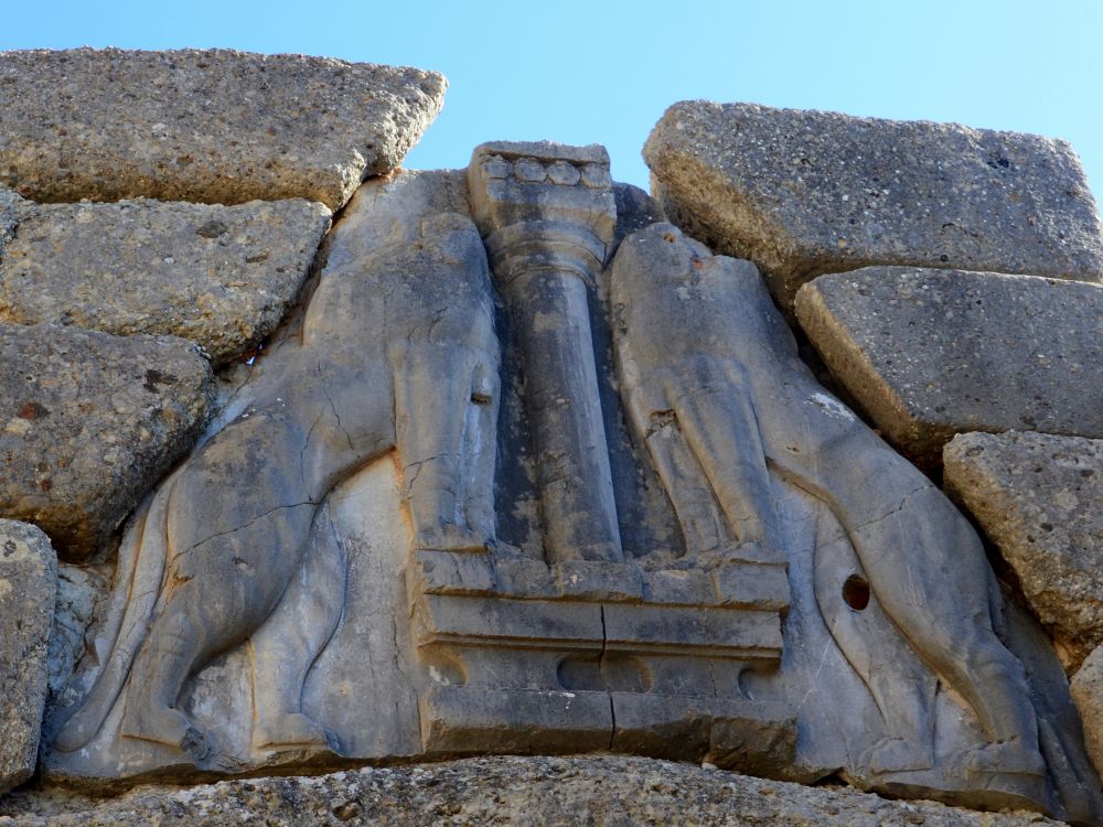 “阿伽门农陵寝”附近著名的“狮门”(Lion Gate)门楣上的双狮。这是已知的最早的青铜器时代的石刻。