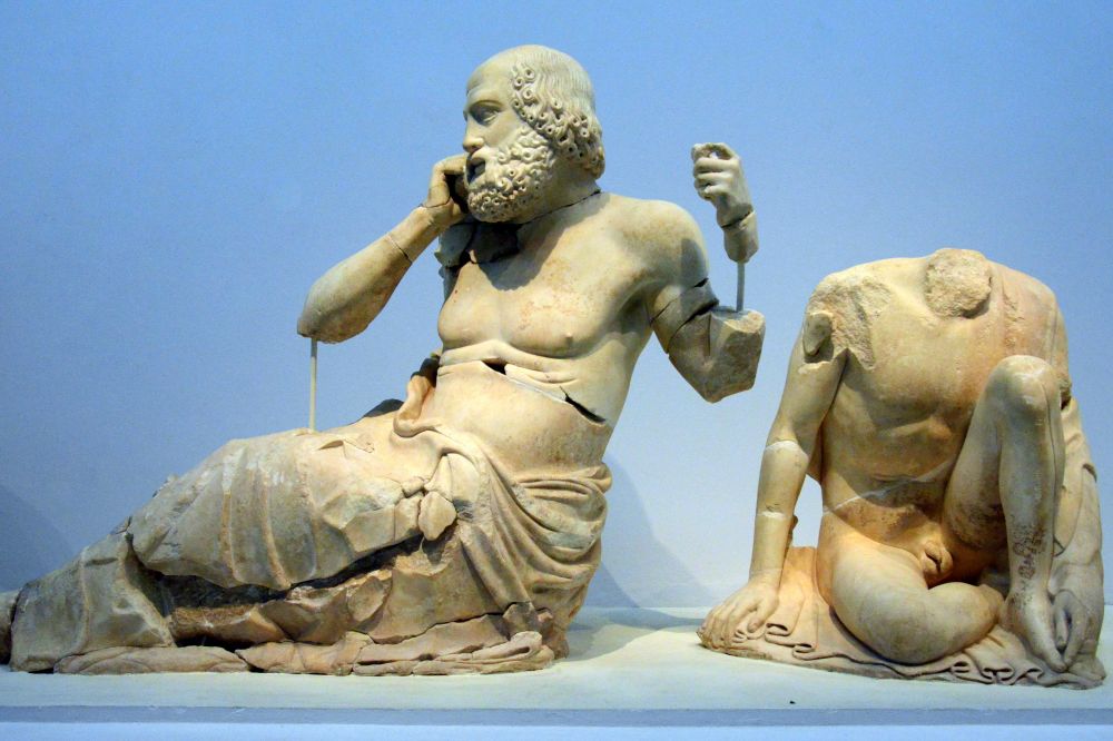 奥林匹亚考古遗址博物馆一:宙斯神庙门楣三角墙上的部分雕像。那位先生在打手机?