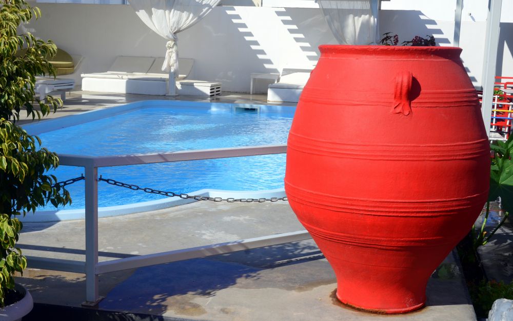 圣托里尼岛的正式名字叫泰拉(Thira或Thera),它呈怪模怪样的半月形,其西北尖角是伊亚(Oia或Ia)镇,中段西侧是岛上最大的费拉(Fira)镇,也是全岛的中心。岛上还有大小不等的十五个村子。全岛人口约一万六千。居民生活用水跟米克诺斯一样,靠一个海水淡化厂提供。