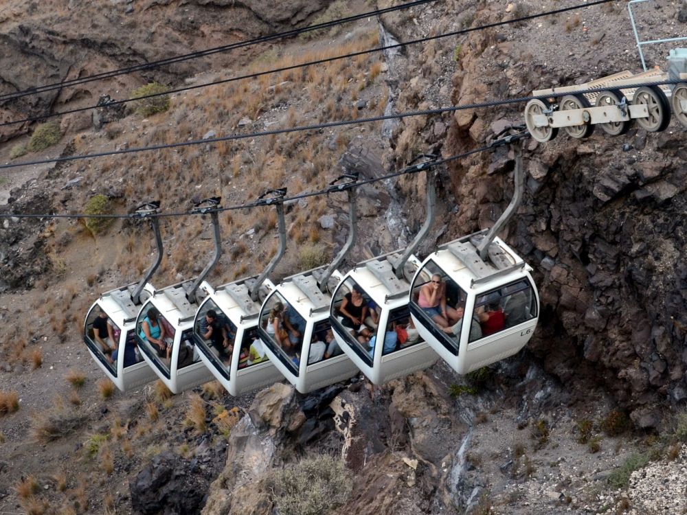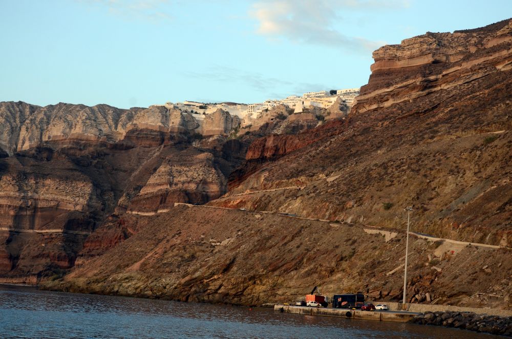 费拉新港,费拉的主要港口。费拉镇就在这堵四百米高的火山口峭壁的上面。