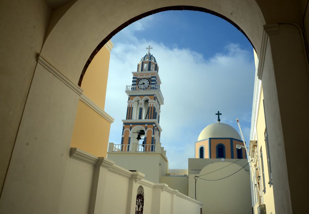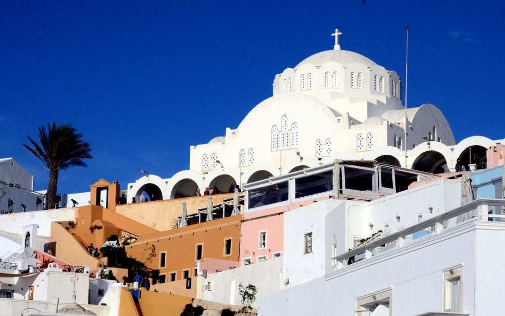 费拉一:1956年七点八级大地震后重建的东正教大教堂。圣托里尼共有三百多座教堂,平均五十多个居民就有一座教堂。