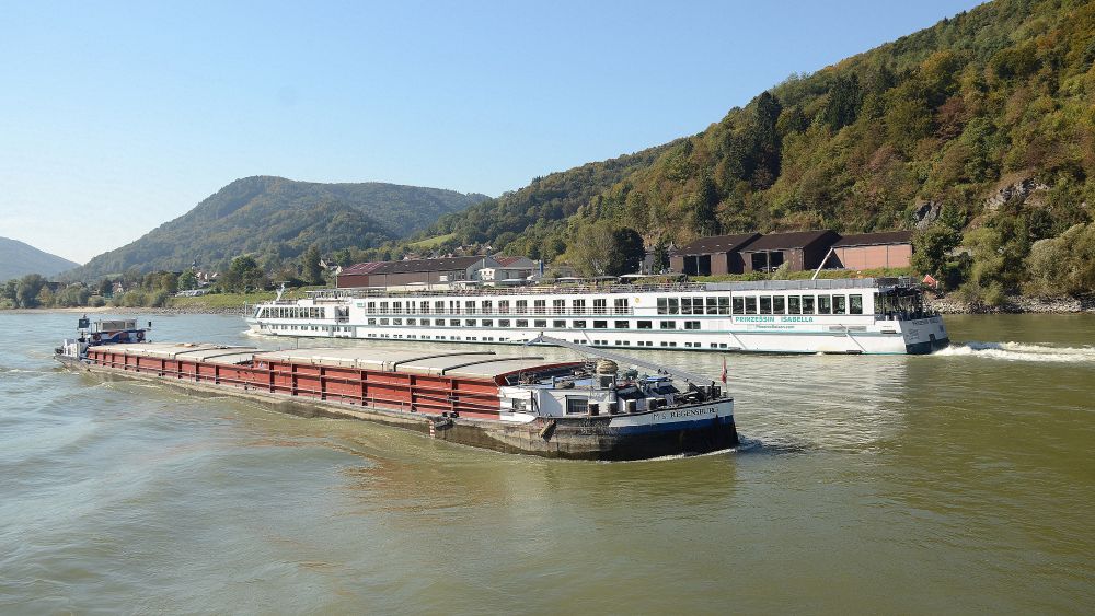 多瑙河河谷风光二:河上的大型拖(推)驳和观光船。