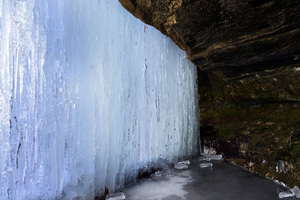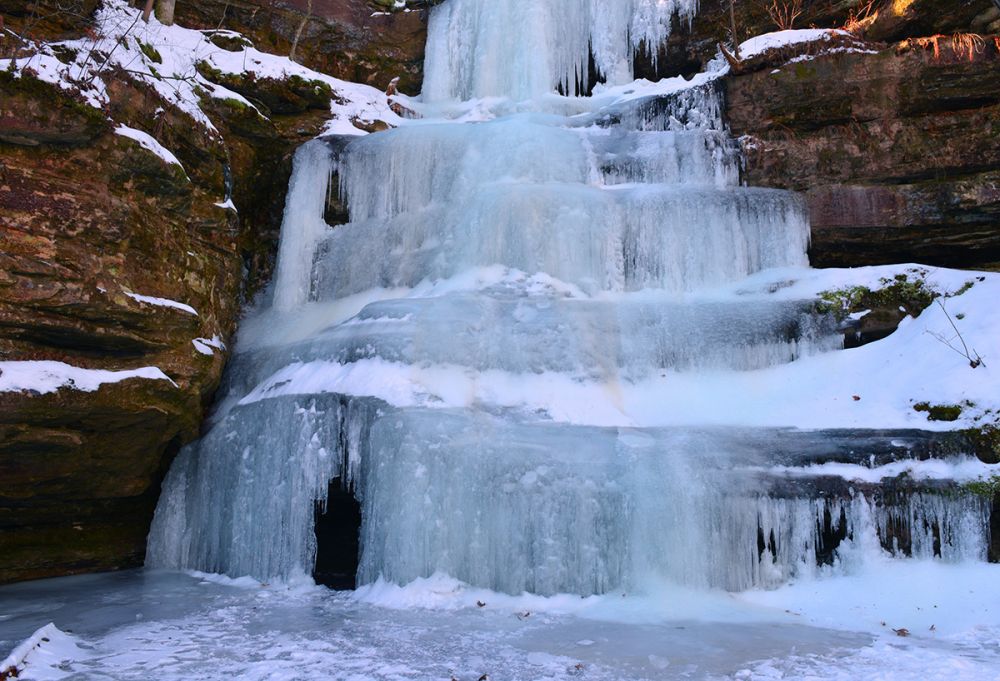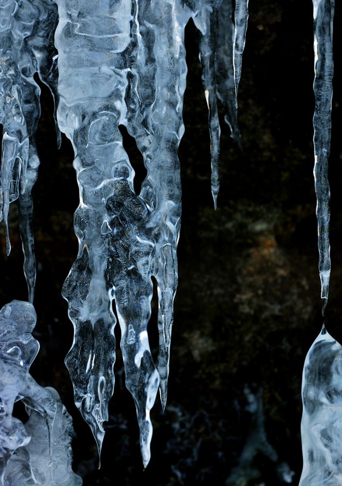 接连几场雪过后,一阵阵凛冽的寒风,依旧肆无忌惮地横行在这片早已尽显苍凉萧瑟的大地上。踏着厚厚的积雪,深一脚浅一脚的前行,一挂冰瀑就这么晶莹剔透的挂在眼前。这本与青山相依,与岩石为伴的小小溪流,停下了它们奔流的脚步,纯净冷艳地演绎着自己的美丽和妩媚。忍不住用手去感触一下冰的温度,入手一片冰凉。看着这睡着了的水,一滴滴一层层,欲滴还流,仿佛被冻结的不是流水,而是那一瞬那的时间。