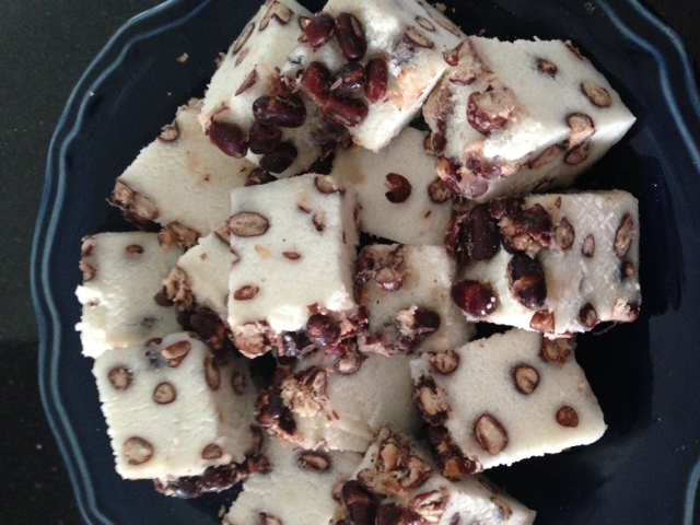 材料:糯米粉2 杯,粘米粉2 杯,糖1/2杯,水适量,蜜红豆一包(见图,中国店买的)。