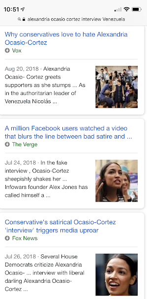 看到这里,事实已经很清楚了。 一个保守派记者Allie Stuckey拍了一个对政治新星Alexandria Ocasio-Cortez反讽的视频。拍视频的人说这是假的,娱乐的。 被娱乐的人也说这是假的,不是她本人。