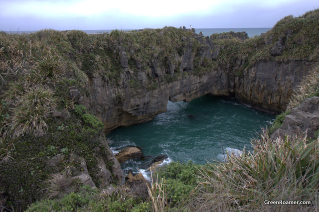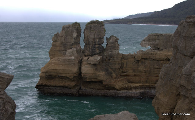 We made a stop in Punakaiki, a town famous for blow holes and “pancake rocks”, layered sedimentary rock that looked like thin slices laid on one by one. The seams are actually softer material that got washed away more than the harder parts. As to why there are these softer layers sandwiched in between there are no definitive scientific explanation yet.