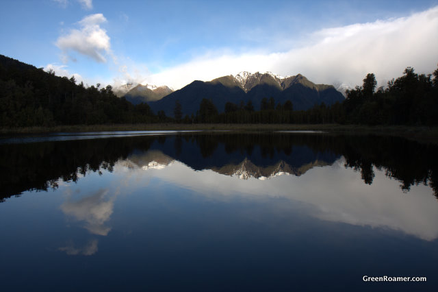 The day was still young when we got back in town. Tracy and I drove to Lake Matheson 8km out of the town. There’s an one and half hour trail around the lake which, when there’s no wind, offers postcard shots of snow capped mountains and reflections in the lake.