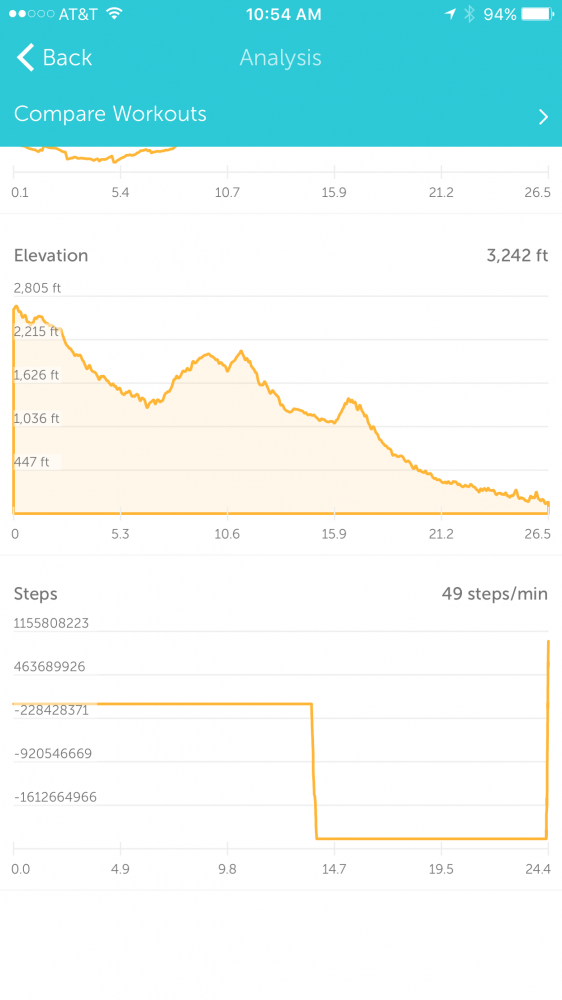 Runkeeper上的高度图(请忽略里面的step chart。天知道这个app是怎么记出来的天文数字。我手机自己记录的步数是63,419步)