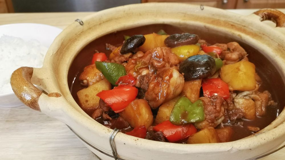 黄焖鸡在国内很流行,大多是外卖便当,因为米饭+肉+菜,咸甜味的汤汁,很有饱腹感。我们之前回国时在店里吃的,是在桌面上电炉上当场做给你看,要等20分钟。小孩子们很喜欢吃那个味道。