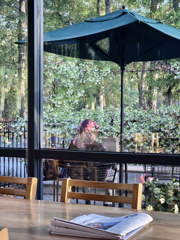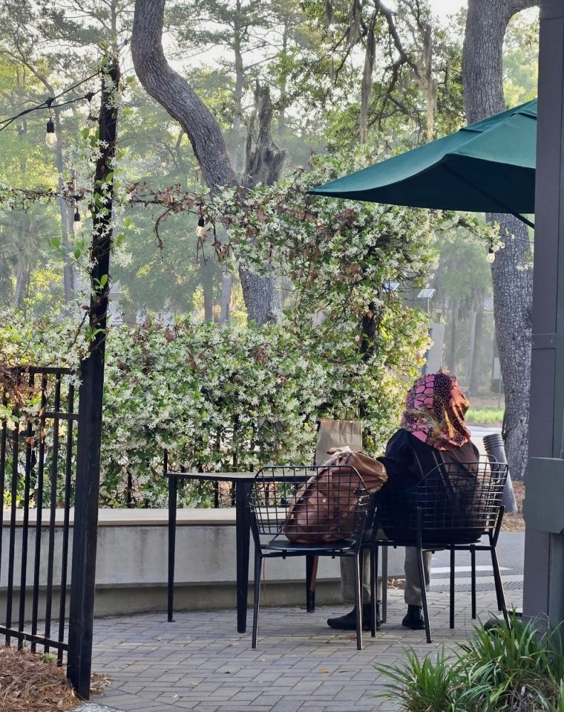 昨天皮卡球比赛之前,我去了附近的一家咖啡馆,咖啡馆门口有两排紫丁香花,有一张桌子和两把凳子,一个非裔女人安安静静地坐在那里,戴着头巾。