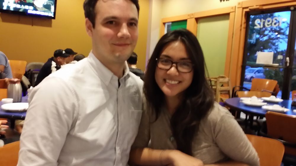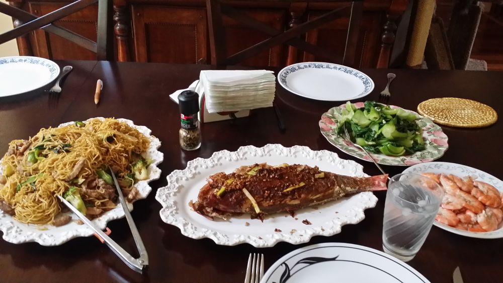 昨晚女儿带男友来家里吃饭,她是下午四点多才说她男友会来,我马上让她去帮我买了一条鱼回来,晚餐用了一个小时零十分钟煮好 上几个星期,我的大学同学一家来访,这晚餐全是我老公做的,同学和他太太说我lG做的牛排比餐馆的还好吃,不过可能是客气话啦 再贴一张女儿和她男友的照片,这是几个星期前,我请他们去一个广东餐馆吃饭时照的。 那餐馆的装修很大众化,但却是我们这最地道的广东餐馆 他们一年多前的片片