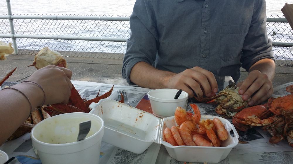 女儿和她的男友帮我庆祝生日,我们在DC的海鲜市场买了螃蟹,大蟹腿,和虾。 让海鲜档的人把螃蟹和大蟹腿煮熟,就在河边找了个地方吃露天午餐。