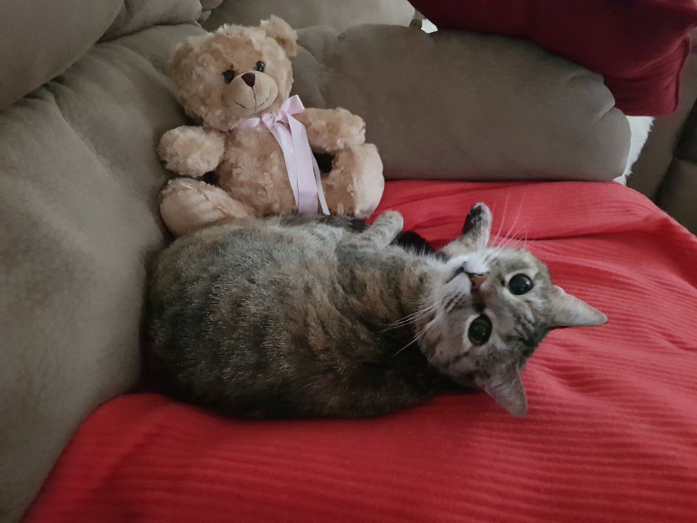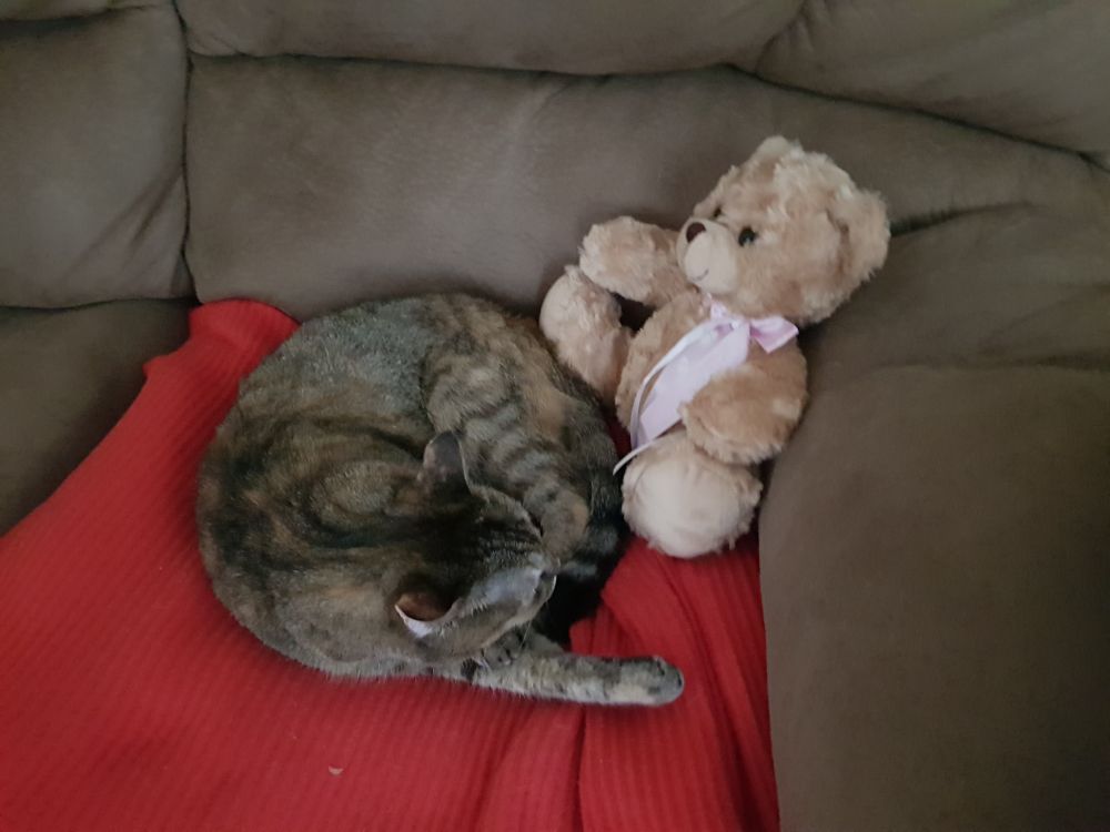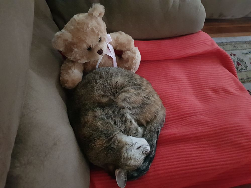 上次买盛菜的盘子, 卖家还送了一只小熊, 我就把小熊给了猫。猫挺喜欢这新伙伴的。 晚上都和小熊睡在一起