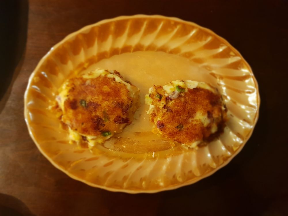 这是吃剩的土豆饼, 他把葱花, bacon 粒, cheese 和土豆泥混在一起, 再放在煎bacon的油里煎, 味道不错的, 就是热量太高了。