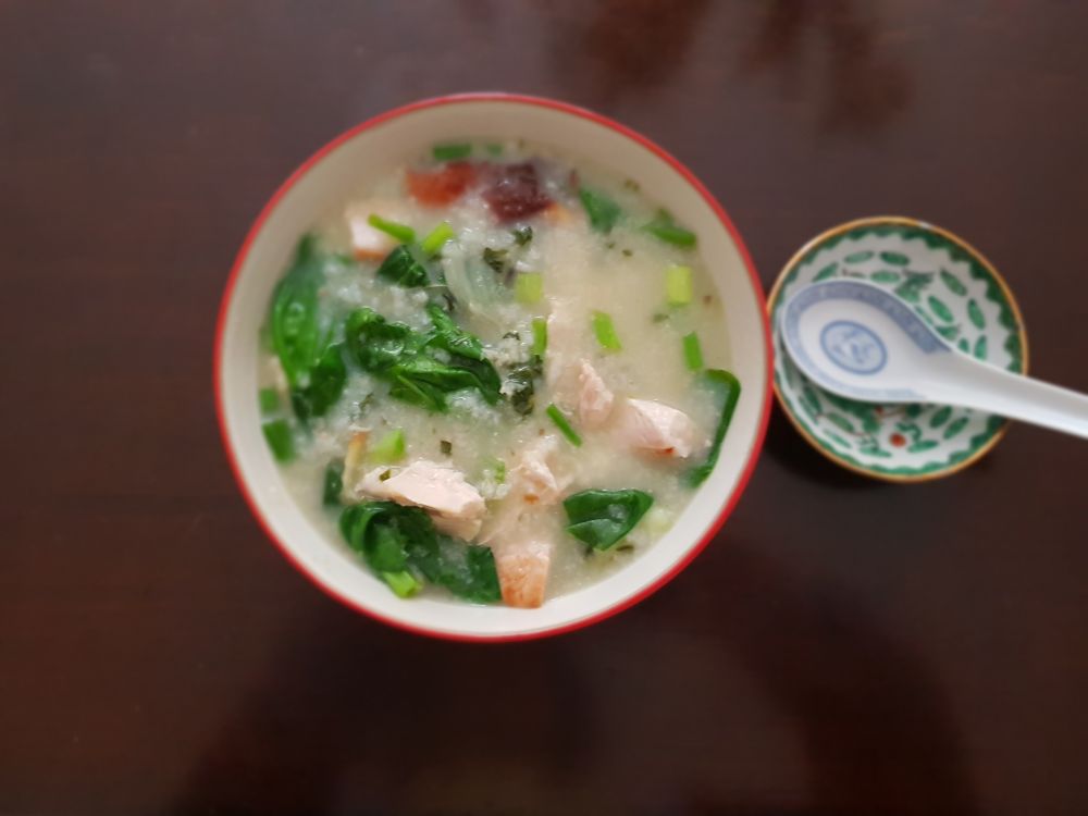 昨天的午餐, 火鸡皮蛋瑶柱蔬菜粥, 他一点粥都不吃的, 我只能自己吃了。