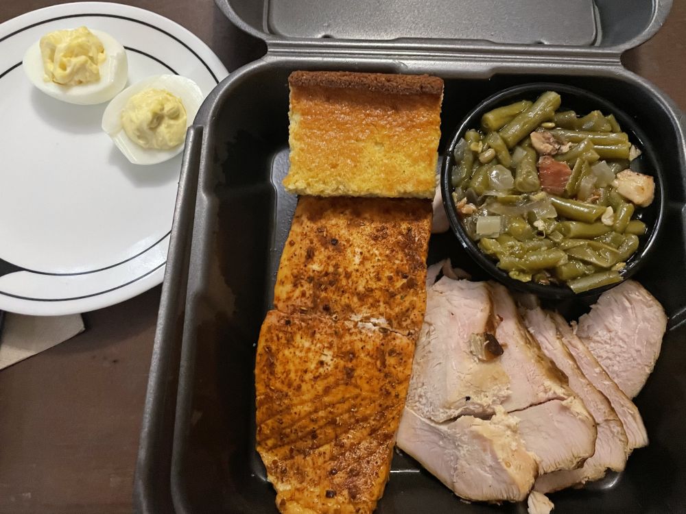 我们周五晚都是买外卖或外吃, 昨天下班回家, 老公已经把外卖拿回来了, 他还把我们各自的小桌子, 刀叉, 他做的devil eggs 放好, 就等我回家一起吃晚饭了。 我订的是烤三文鱼和烤火鸡