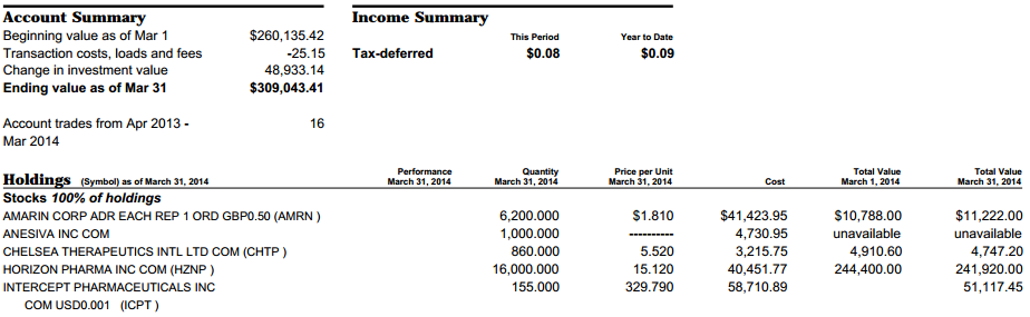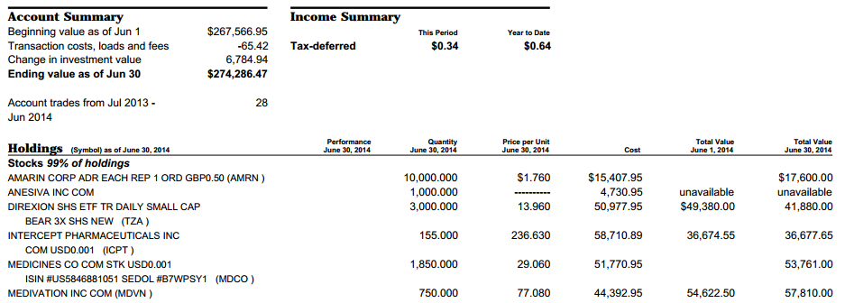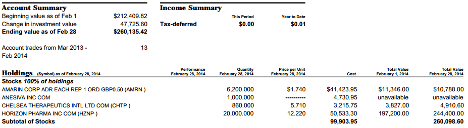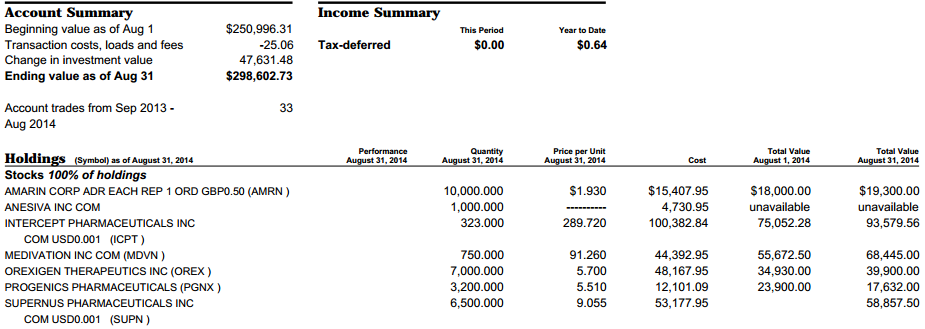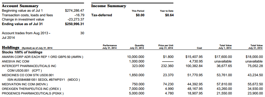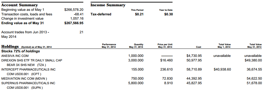 其实2014年对神话公司发生的双向性事件结果的预测成功率是极高的(只有OREX的延期三月与POZN的两次CRL,预测错误)。但事实是虽然看对了,就是不赚钱,真成了亏本赚吆喝。主力部队一直处于被套状态,演变成郁闷的持久战,其中较大的头寸是OREX,RMTI,ICPT等。虽然在MDVN,SUPN上略有斩获,但还是难填亏空。