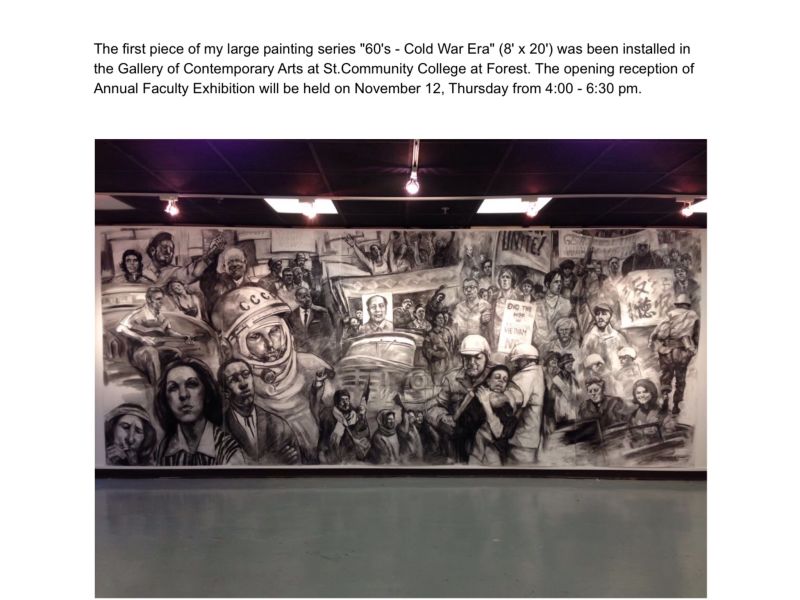 一年一度的圣路易斯社区大学美术系教师画展于11月12日开幕。我被左映雪教授的巨幅画作《六十年代·冷战时期》《60'S一ColdWarEra》(高八尺,宽二十尺)深深地打动,站在旁边的一位美国中年女观众感慨地说:“站在这样的画前,忍不住想流泪。”我深有同感。在这幅作品里,左教授大胆地[