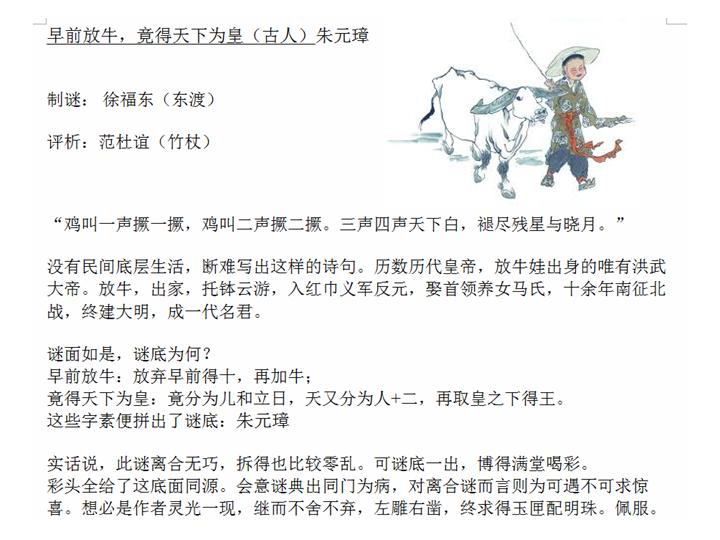 谜评:早前放牛,竟得天下为皇(古人)朱元璋