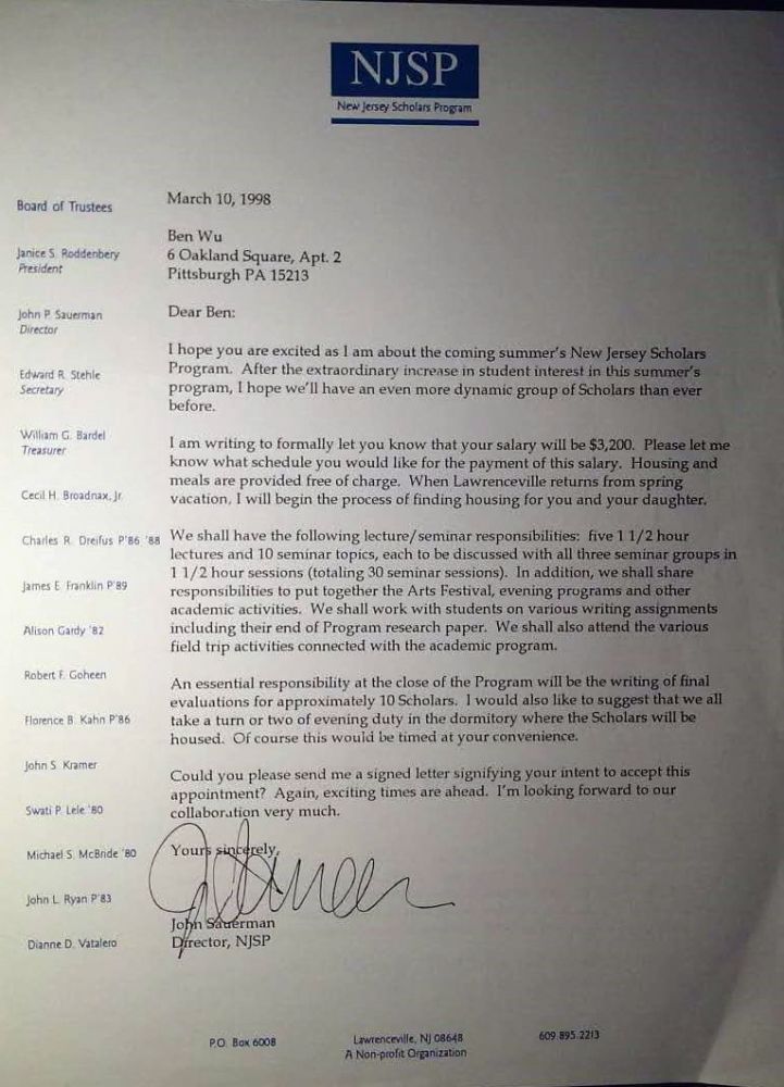 上图是新泽西学者项目邀请我去做1998年教师的正式邀请信,是当时的项目指导约翰·萨德曼先生签署的。
