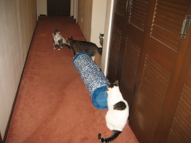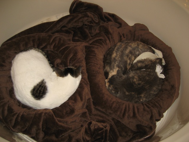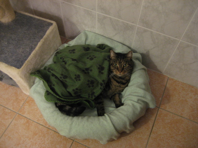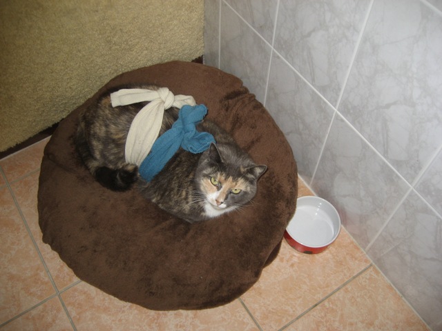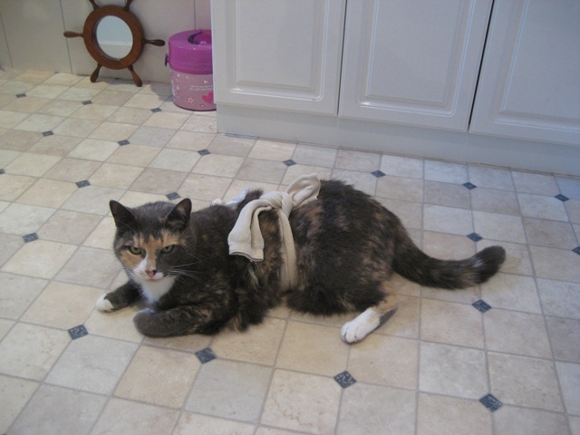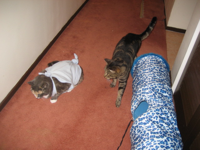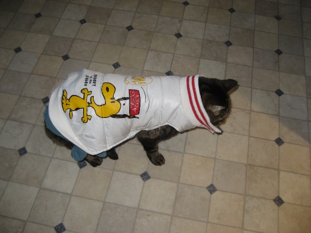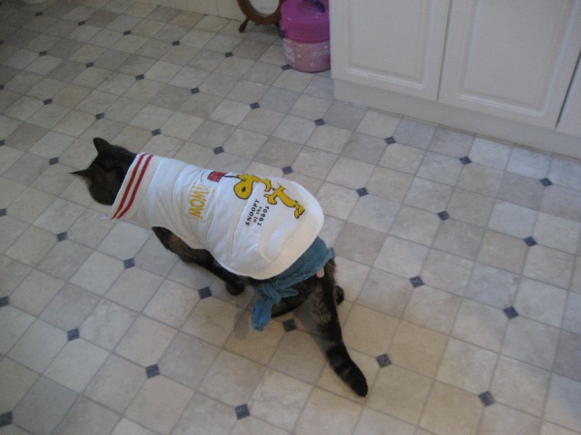 金卡手术费$330 多不说, 郁闷的是金卡背上的毛被剃掉好大一片, 天气又渐冷, 穿的衣服一会儿就被蹭掉, 看着她背上光光的一大片, 这个忧心啊, 急中生智只好找了一件猫爸的背心给套上并上下拴紧了才得以保暖遮丑, 长了好长一段时间毛才长回来啊, 心里直后悔带她去了vet, 但是话又说回来, 经过vet手术清理后伤口肯定是比自己在家里磨安全可靠放心多了.