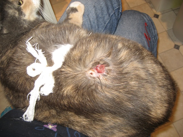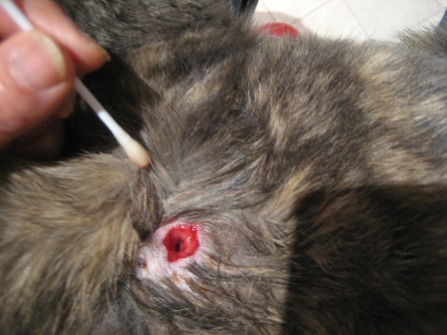 这次添添的伤口没有金卡严重, 所以金椒妈我, 一为了省银子,二不想添添毛被剃掉一大片, 就在家自己护理了. 伤口的照片是刚才晚上下班回家换药时拍的,已经比清早好一些了. 这伤口看着就像是钉子砸的洞呢? 但伤口在后背接近尾巴处, 猫怎么会自己用后背往钉子上倒呢? 今晚添添明显蔫了不少, 自己跑到窝里呆着, 并且还又打喷嚏又流鼻涕? 上月刚打过疫苗的啊, 嗨?