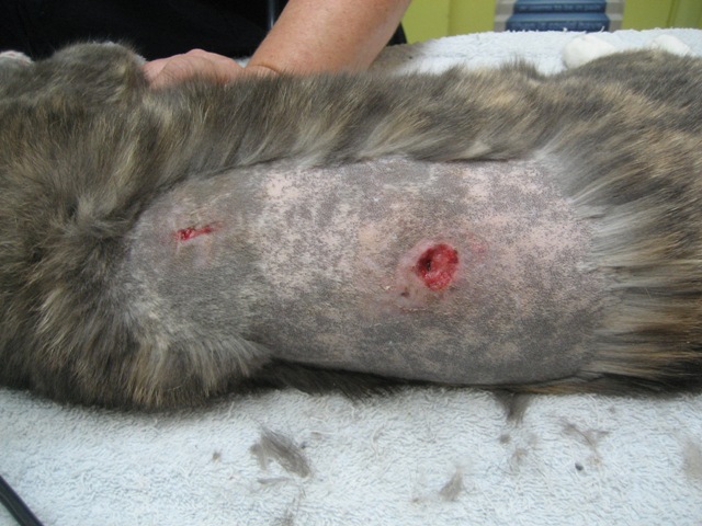 今早正准备上班, 添添下楼时路过我身边,就顺手摸了他一把, 咦, 怎么摸到他背上毛硬帮帮的? 心想有啥不对了? 于是把他抱到亮光下检查, 用棉球把粘在一团的毛轻轻用清水洗开后, 又发现两个洞, 已经贯浓了, 用棉签将浓挤出, 洞足有5毫米深, 直径也有5毫米, 请家长们看看到底是事故还是猫咬, 狗咬还是人为伤害的呀?