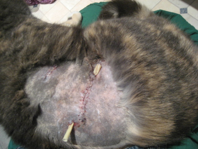 以为vet会跟我类似处理伤口哈,结果vet说必须手术, 麻醉后将两处伤口切开, 清理掉坏死组织, 并安放了一根疏通软管便于浓水流出, 三天后取出.