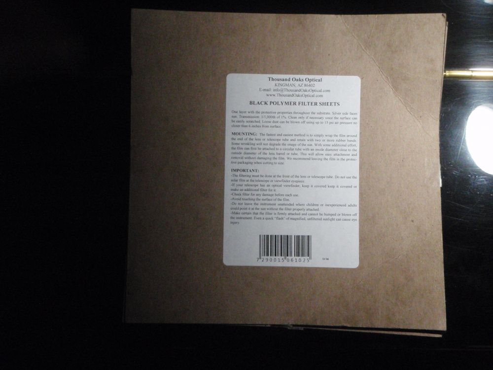 1. solar filter sheet 8x8' (原来在Amazon买的,现在已经没有了),eBay Gravitis AstroSnap Solar Filter Sheet ISO 12312-2 8x8 Inches,不知道是不是我买的那种, 我买的是一面像镜子,另一面漆黑: