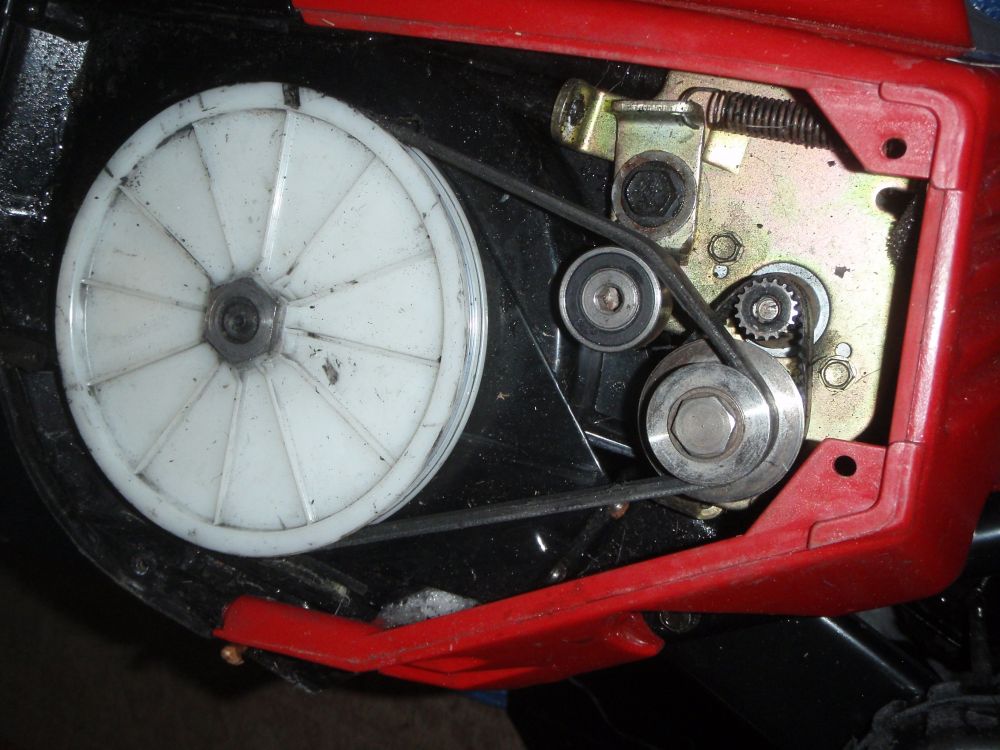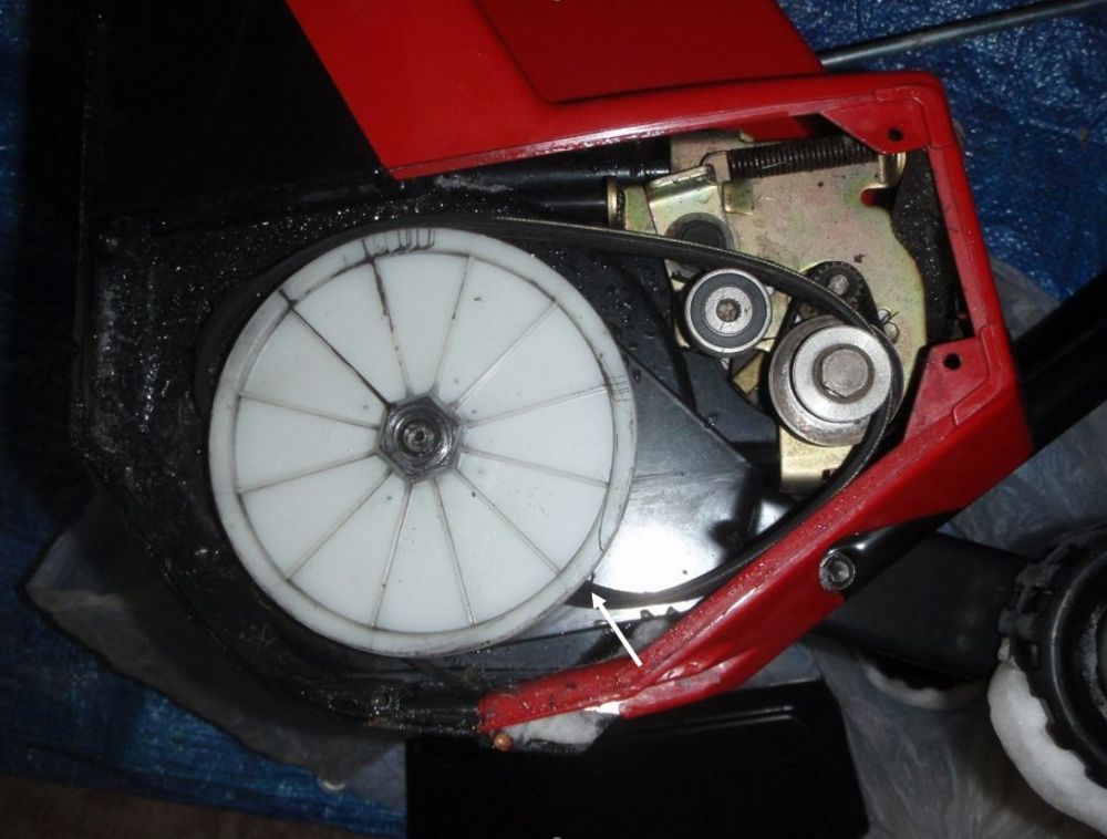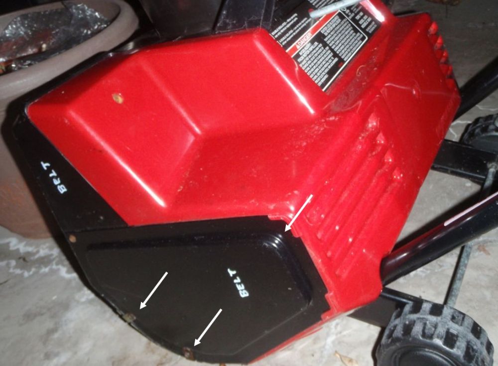 前天铲着铲着雪,电铲雪机(Toro牌子)电机转,铲雪机铲轮不转了。估计是皮带从主动轮、从动轮脱落了。