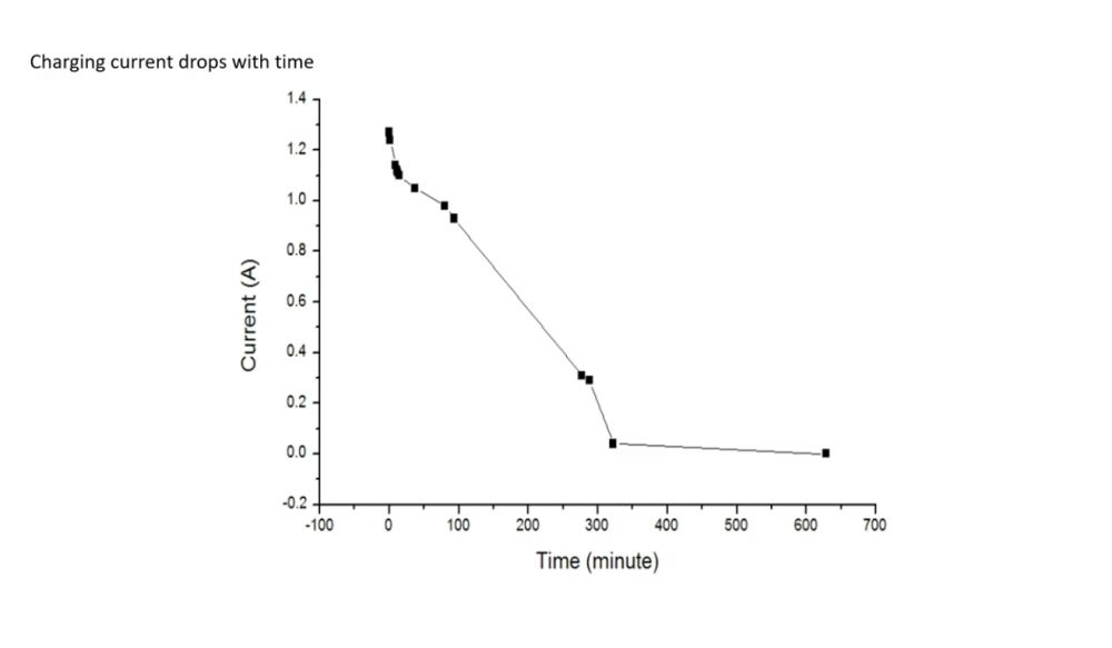 恒流(CC)阶段:充电器提供稳定的固定电流,同时电池电压逐渐上升。这是快速充电阶段(通常可充入约 70-80% 的电量)。