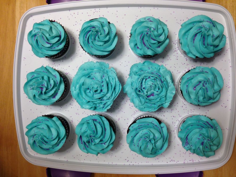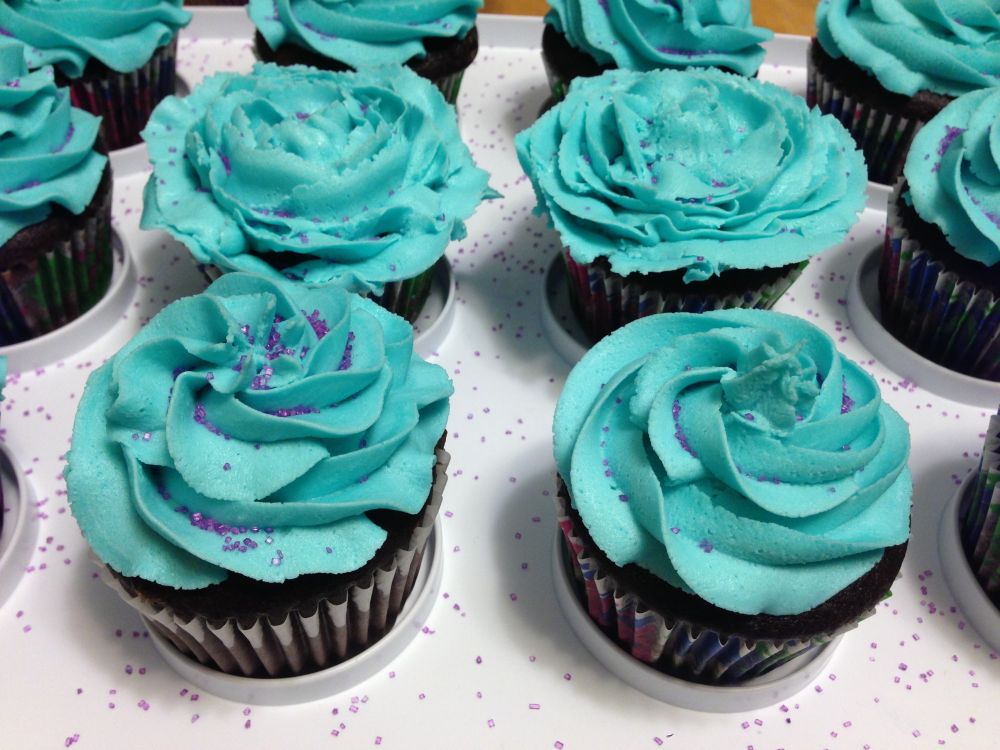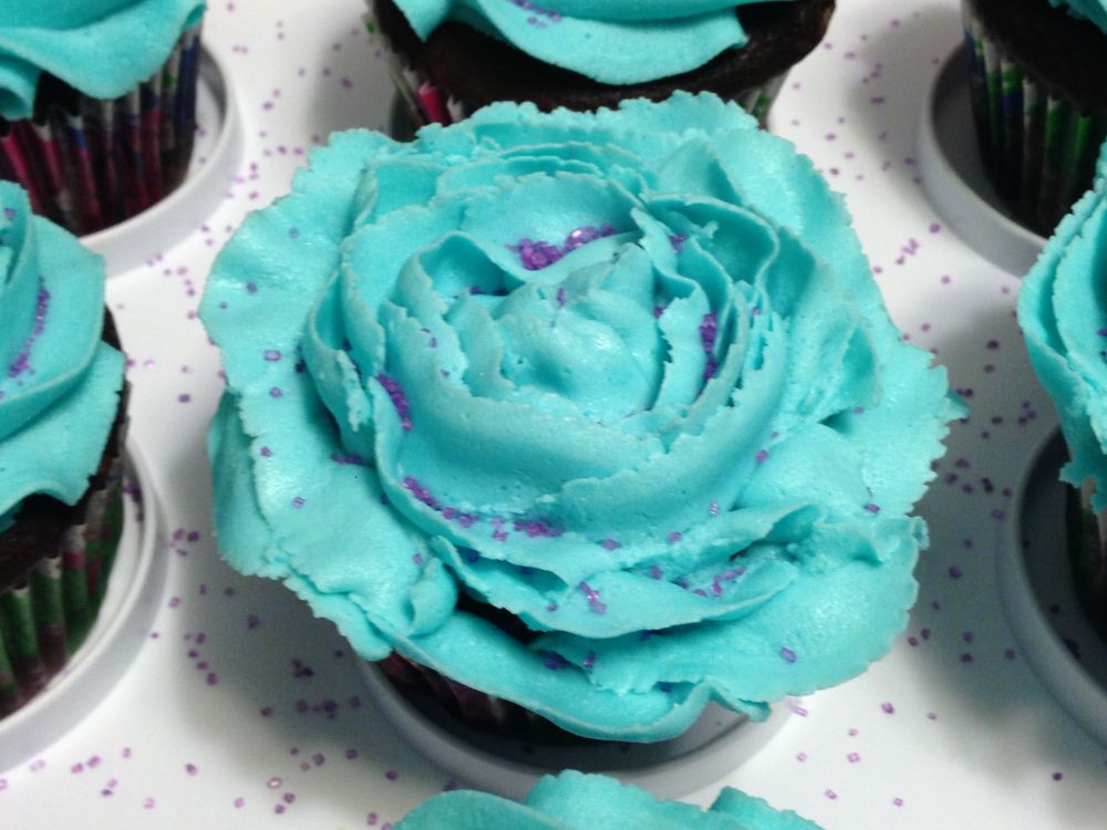 这是送给同事女儿的20岁生日礼物, 巧克力纸杯蛋糕加蓝色的Butter Cream Icing,都是她女儿的最爱。今天的Icing整了点小花样,中间那两个蛋糕上的Icing挤了朵大花儿。 第一次在CUPCAKE上挤花,感觉ICING太稀了,不好定型,下次若是再做的话会稍微调整一下的。做出来的花比较粗糙,不能细看,但是颜色效果很满意,跟TIFFANY家的蓝色一样的,好多朋友看了图片都说喜欢。