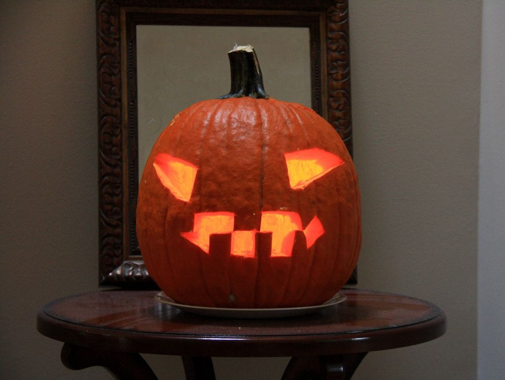 这是儿子的JACK-O-LANTTERN,他认为一定要是一个HAPPY FACE,我只好从命把眼睛挑起来。