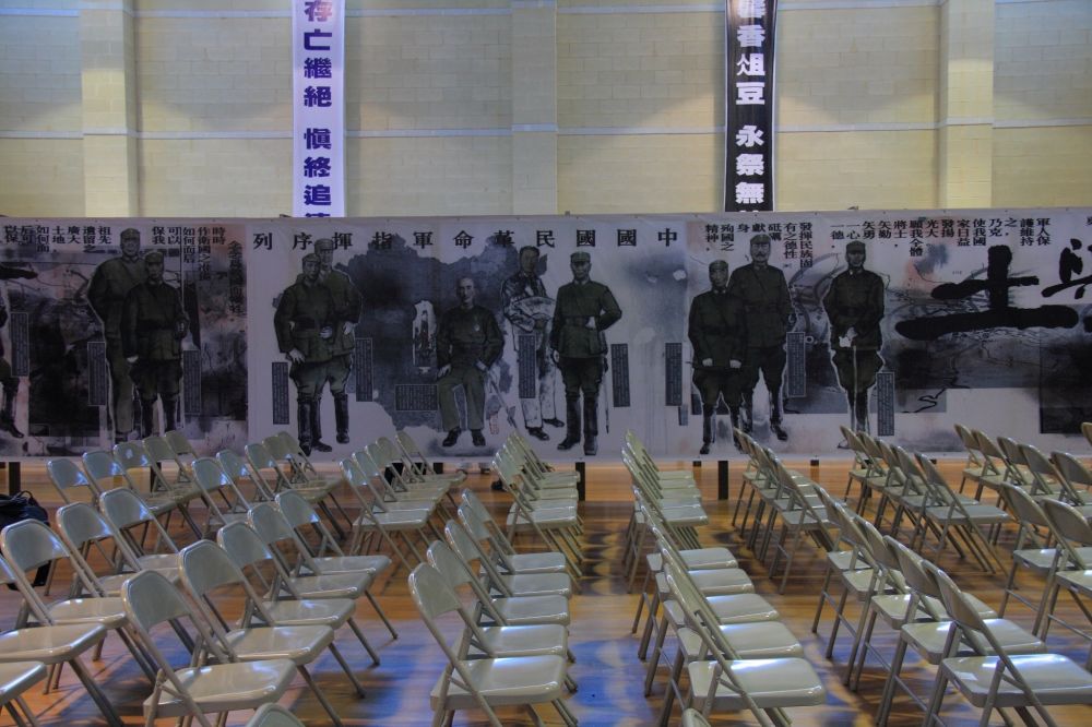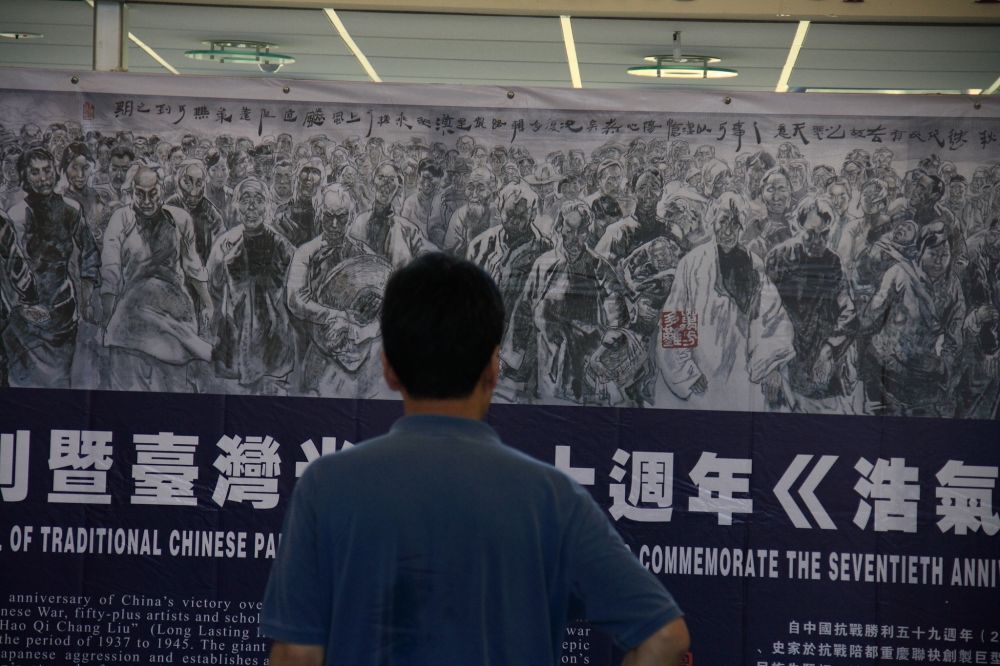 长卷水墨'浩气长存'昨日开展,我们过去看了,很长的画卷,很大的人物绘在图上,很多数字 ,标语,国军牺牲的将士的姓名在一遍一遍地播出。