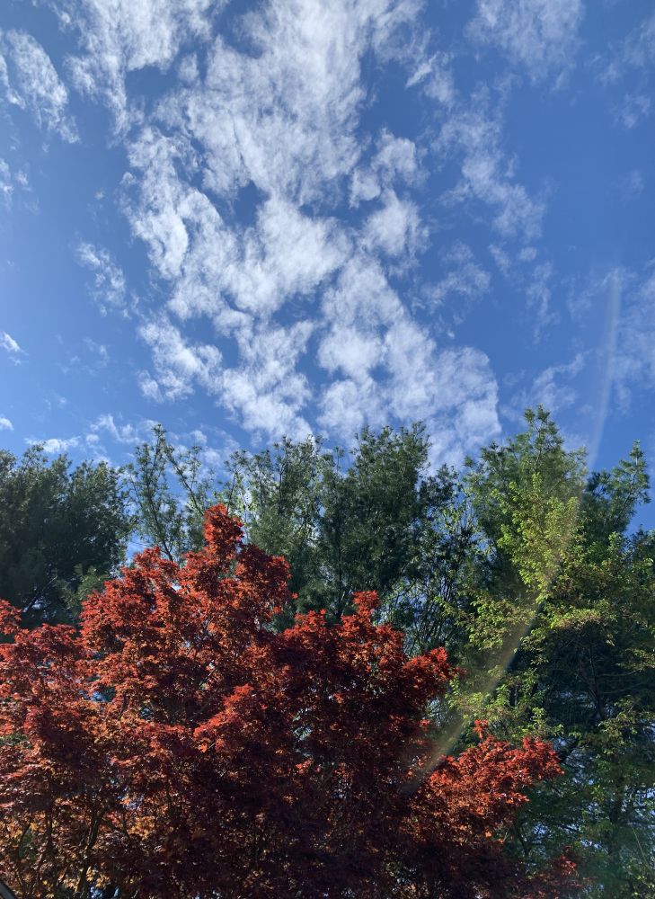 复活节的早晨,空气清新美丽.蓝天白云下的新发树叶比花还动人,被晨光穿过的叶子真好看