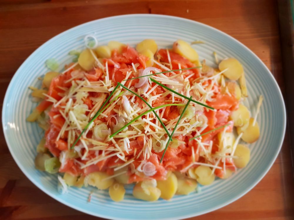 话说有一次做挪威腌三文鱼不小心盐放多了。直接食用有点儿太咸了。想起腌鳕鱼沙拉,就做了这道腌挪威三文鱼沙拉。