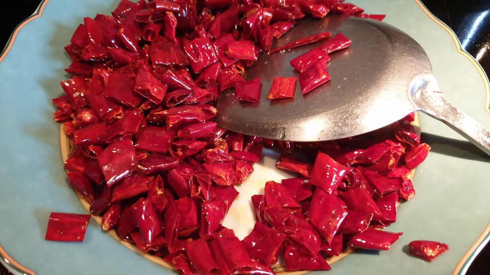 2、无籽辣椒过油爆香,注意火不要太大,避免炒糊变苦。